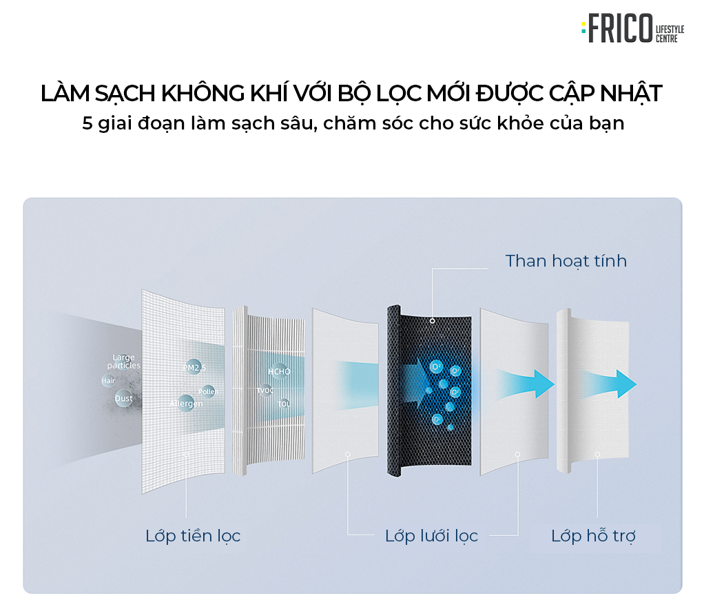 Máy lọc không khí 3 tác động Pro FC-AP162 sử dụng hệ lọc nhiều giai đoạn, trong đó nổi bật là lõi HEPA giúp lọc bụi mịn và các tác nhân gây dị ứng trong không khí. Lớp than hoạt tính hỗ trợ giảm mùi sinh hoạt và mùi khó chịu, mang lại không gian dễ chịu hơn khi nấu ăn, nuôi thú cưng hoặc thường xuyên đóng kín cửa.