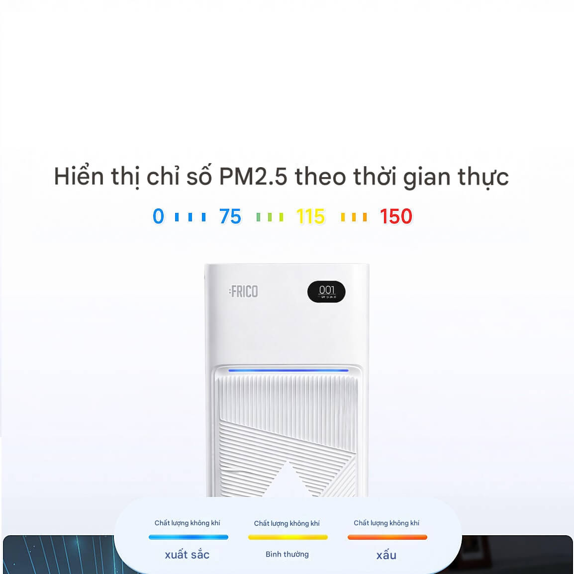 Một ưu điểm nổi bật của Frico FC-AP162 là khả năng hiển thị trực tiếp chỉ số PM2.5 trên màn hình. Người dùng có thể dễ dàng quan sát chất lượng không khí tại thời điểm sử dụng. Đồng thời, hệ thống đèn báo trên thân máy sẽ thay đổi màu sắc theo mức bụi mịn, giúp nhận biết nhanh chóng tình trạng “không khí đang sạch hay cần tăng cường lọc”.