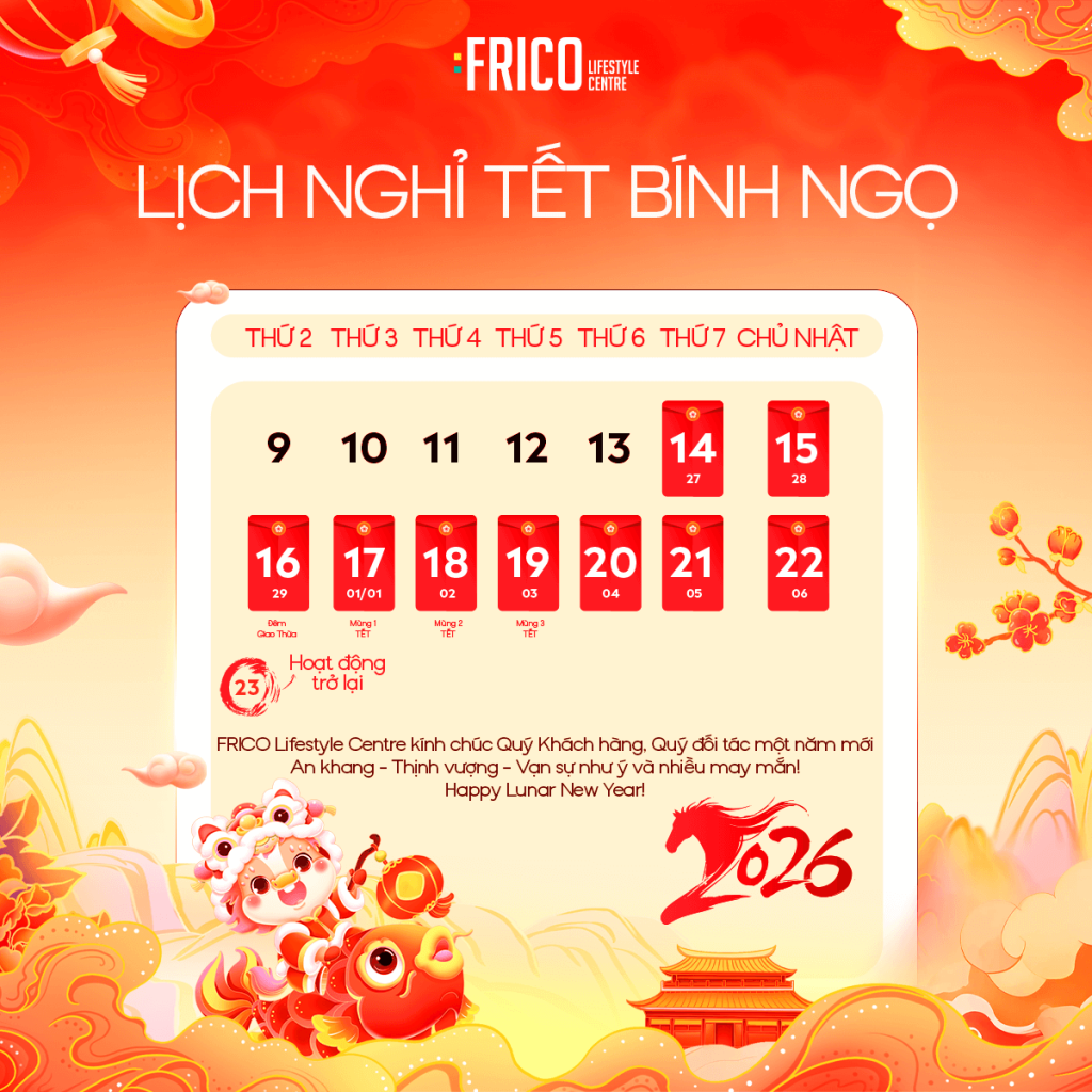 Hòa trong không khí hân hoan đón chào Xuân Bính Ngọ 2026, FRICO Lifestyle Centre xin gửi đến Quý khách hàng, Quý đối tác lời chúc Sức Khỏe – An Khang Thịnh Vượng – Vạn Sự Như Ý.